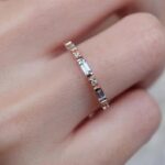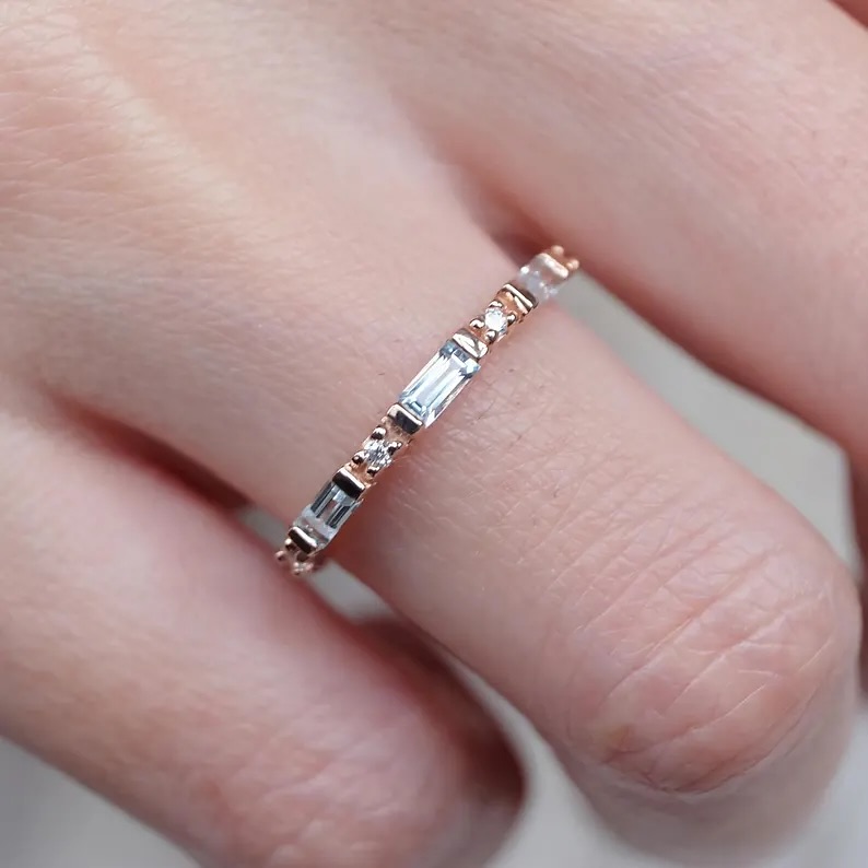 This exquisite 14k rose gold baguette wedding band features beautiful aquamarine stones and sparkling cz, making it the perfect symbol of love and commitment. Ideal for stacking, this eternity band is a dainty yet meaningful choice for weddings, anniversaries, or a special promise.