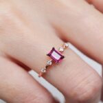 This stunning 14k rose gold ring features a vibrant rhodolite garnet baguette at its center, accented with sparkling cubic zirconia for added brilliance. Perfect for engagements, special occasions, or adding a touch of elegance to any outfit.