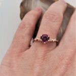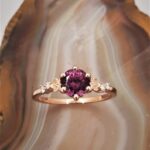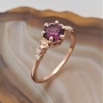 Delicate beauty, timeless charm. This 14k rose gold ring features a stunning rhodolite garnet set in an elegant floral design, surrounded by sparkling diamonds. Perfect for those who love a touch of romance and sophistication.