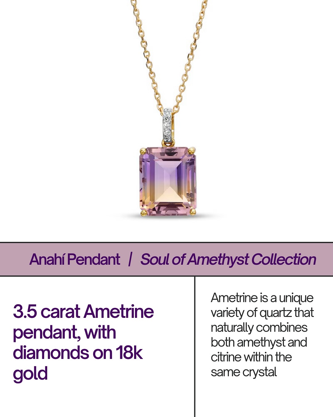 This exquisite 3.5-carat ametrine pendant, set in 18K gold and accented with brilliant diamonds, embodies the natural beauty of two powerful gemstones—amethyst and citrine. The rich blend of deep purple and golden hues creates a one-of-a-kind piece, perfect for those who appreciate elegance and meaning in their jewellery.