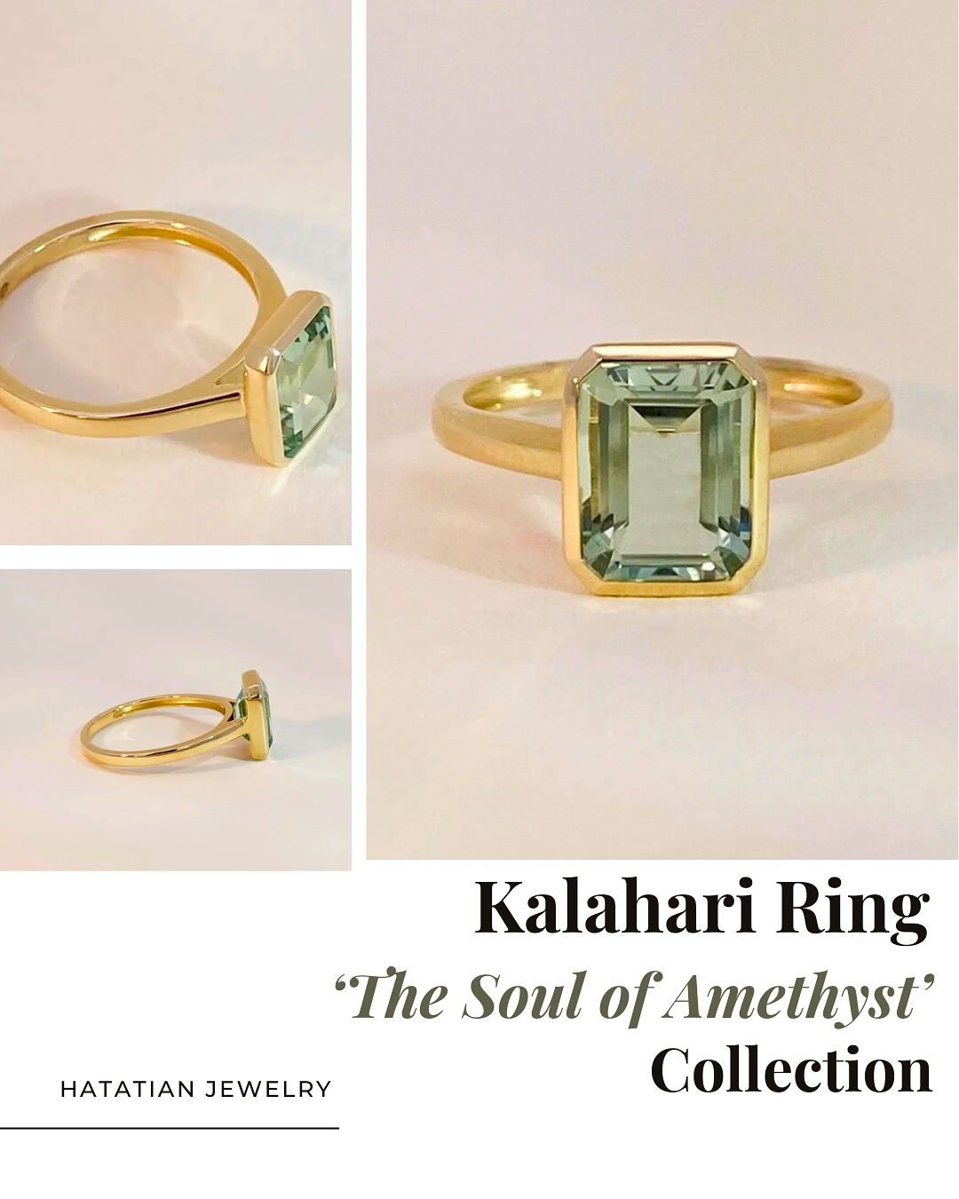A masterpiece of elegance and rarity, the Kalahari Ring features a 4-carat emerald-cut Green Amethyst (Prasiolite) from Namibia, set in a meticulously handcrafted double bezel setting of solid 14K gold. Inspired by the vast beauty of the Kalahari, this ring embodies understated luxury and timeless sophistication.