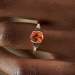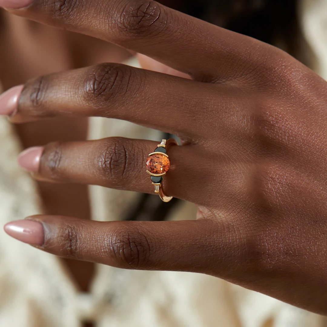 2 carats of Tanzanian spessartite garnet, January’s birthstone of vitality and fearless energy. Black onyx and diamonds stand like quiet guardians, but it’s the garnet that speaks: of creativity that sparks from within. Wear it and feel the fire awaken, a bold statement of youth, courage, and the life you’re meant to manifest.