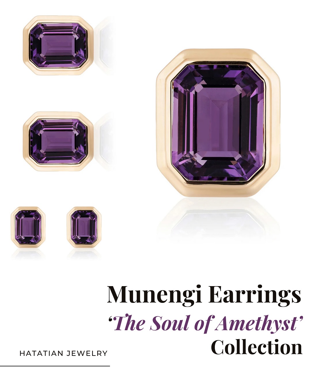 Derived from the Kamba word “Munengi,” meaning Giver, earrings symbolise Mother Earth’s generosity, gifting us the deep purple beauty of Kitui ethically mined amethyst, each 1.5-carat emerald-cut gemstone set in a double bezel of 14K gold.