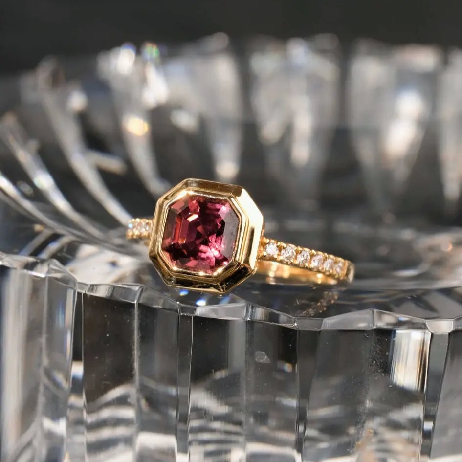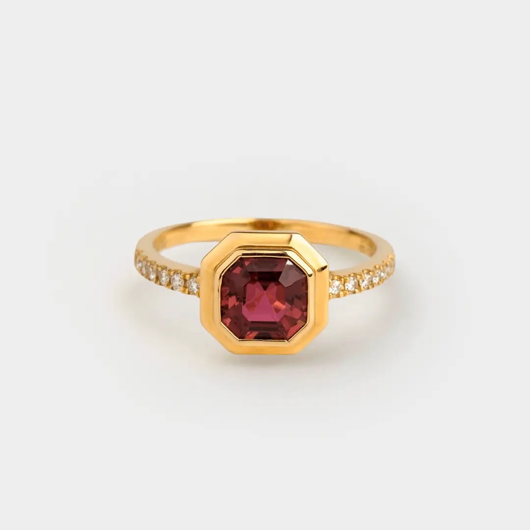 Crafted for those who appreciate elegance in every facet—this 1.05-carat Asscher-cut Pink Tourmaline glows with warmth, embraced by a halo of accent diamonds. Set in 18K yellow gold with a refined double bezel, it’s a statement of grace, strength, and individuality.