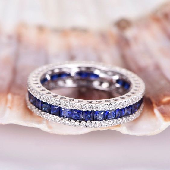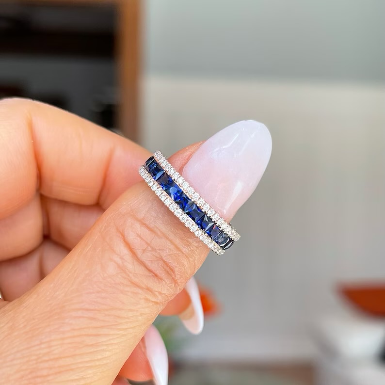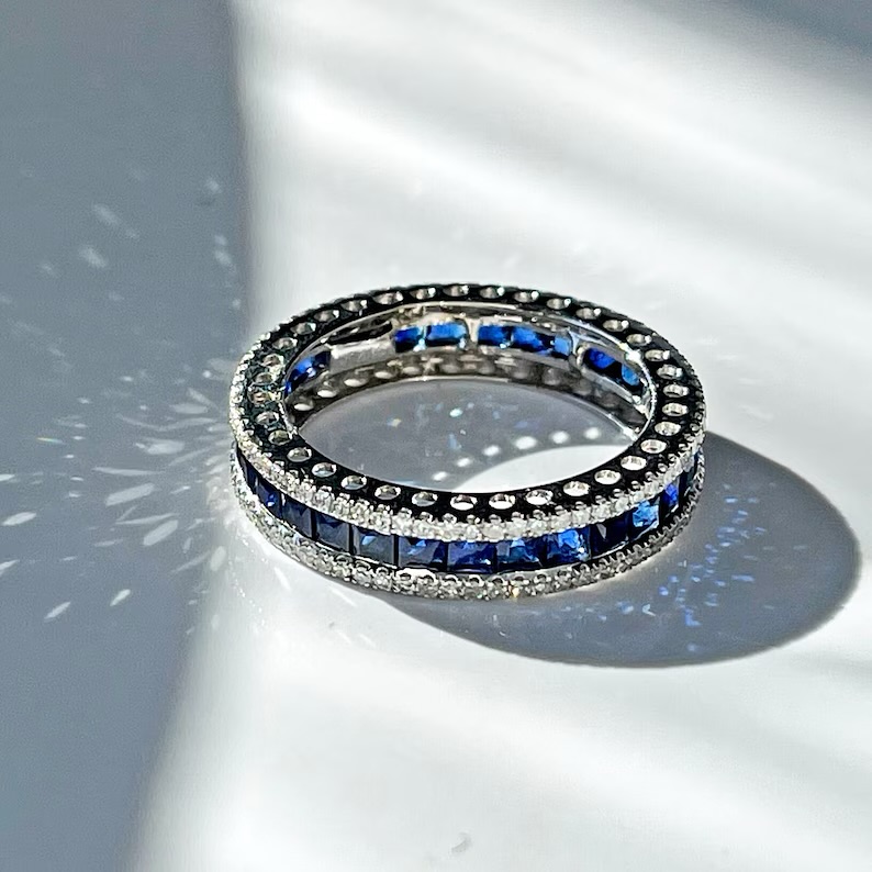 The Stone & Sky Ring — a breathtaking harmony of deep blue sapphires and radiant diamonds, meticulously set in an eternity luminous 18 karat white gold. The sapphires channel the depth of the night sky, while the diamonds mirror a constellation of stars, creating an eternal band of light and color. A design that celebrates balance, brilliance, and the beauty of contrast.
