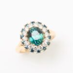A Kenyan teal sapphire, deep and hypnotic, shifting between ocean blue and forest green — the kind of color you don’t forget once you’ve seen it. Encircled by a diamond halo, then finished with an outer halo of teal sapphires, this ring feels layered, intentional, and quietly commanding.
